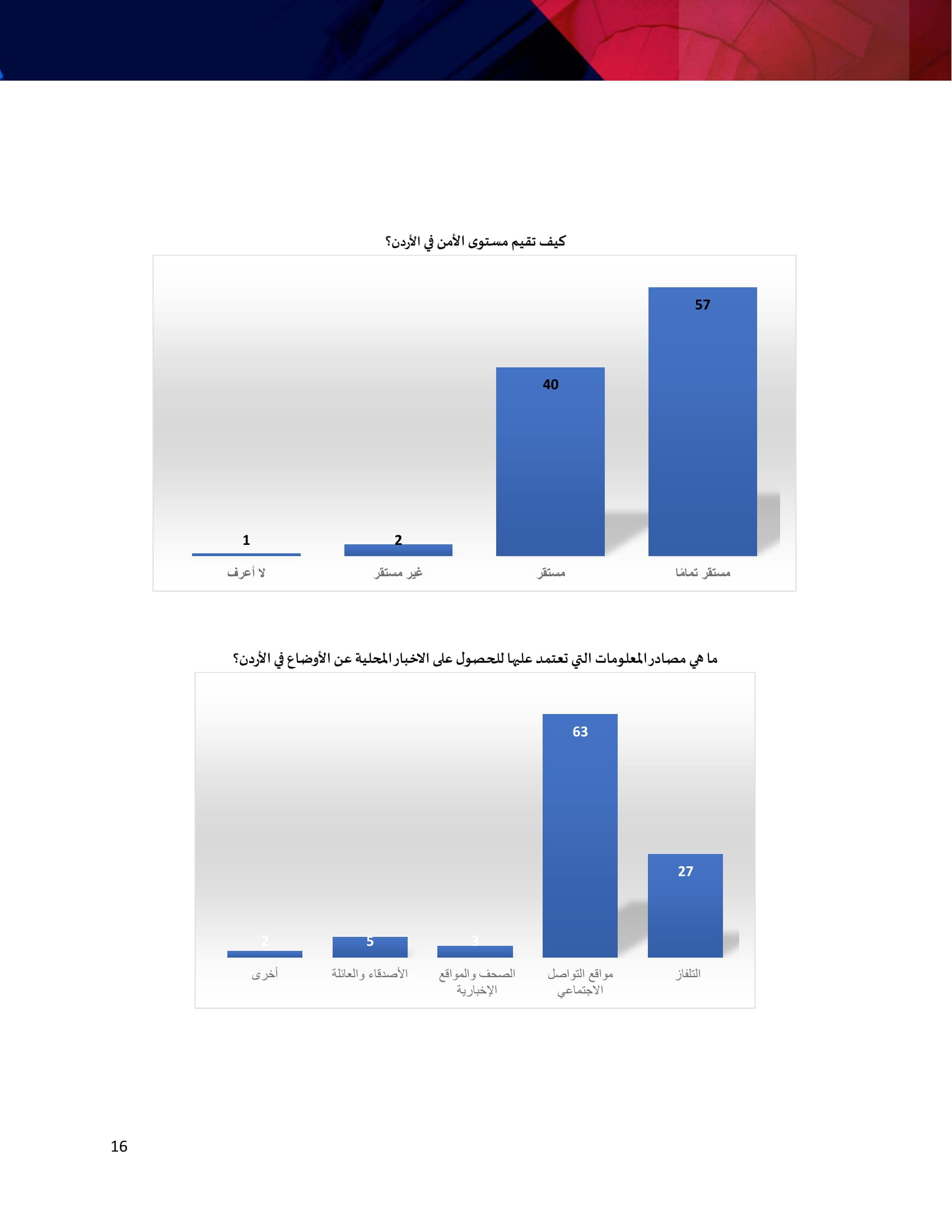 وبالعودة إلى القضايا المحليَّة، أظهرت نتائج الاستطلاع أن 63% من الأردنيين يعتمدون بشكل رئيس على مواقع التواصل الاجتماعي كمصدر للمعلومات حول الأخبار المحلية والأوضاع في الأردن، مما يجعلها المصدر الأكثر استخدامًا، يليها التلفزيون بنسبة 27%، فيما يشكل الاعتماد على الأصدقاء والعائلة كمصدر للمعلومات ما نسبته 5%.