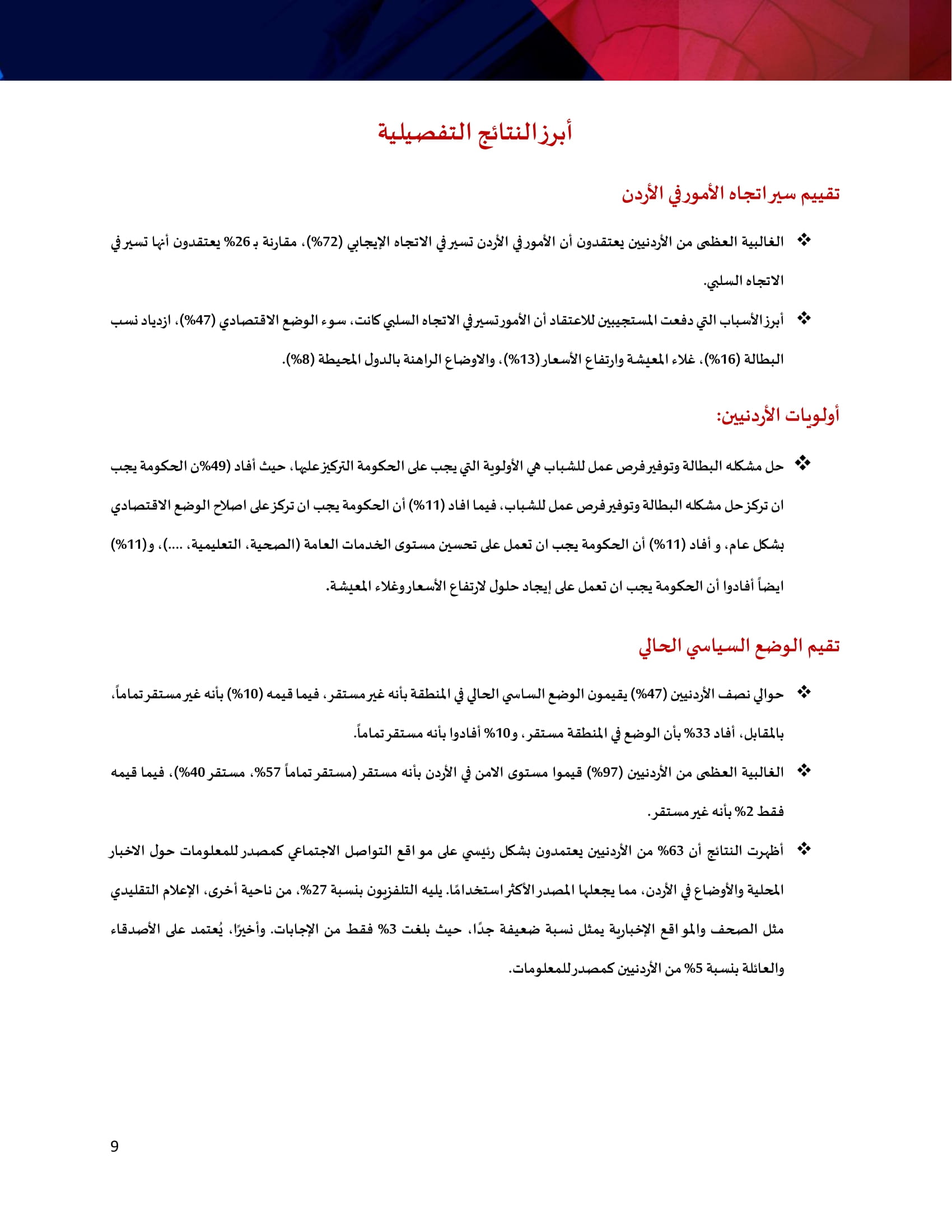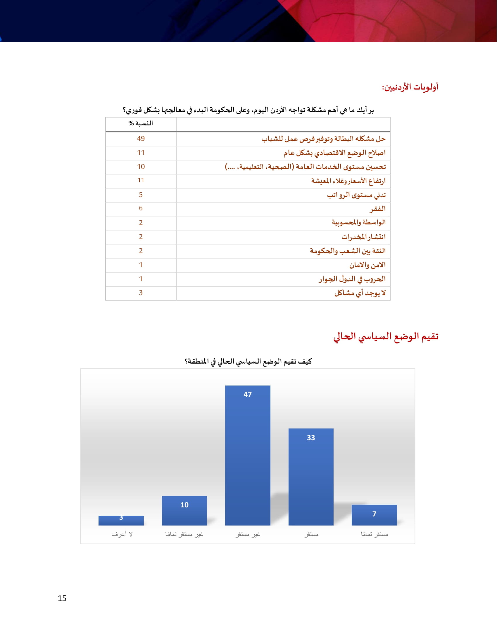 * 49% من الأردنيين يرون أن أهم الأولويات بالنسبة لهم هي التركيز على إيجاد حلول للبطالة وتوفير فرص عمل للشباب