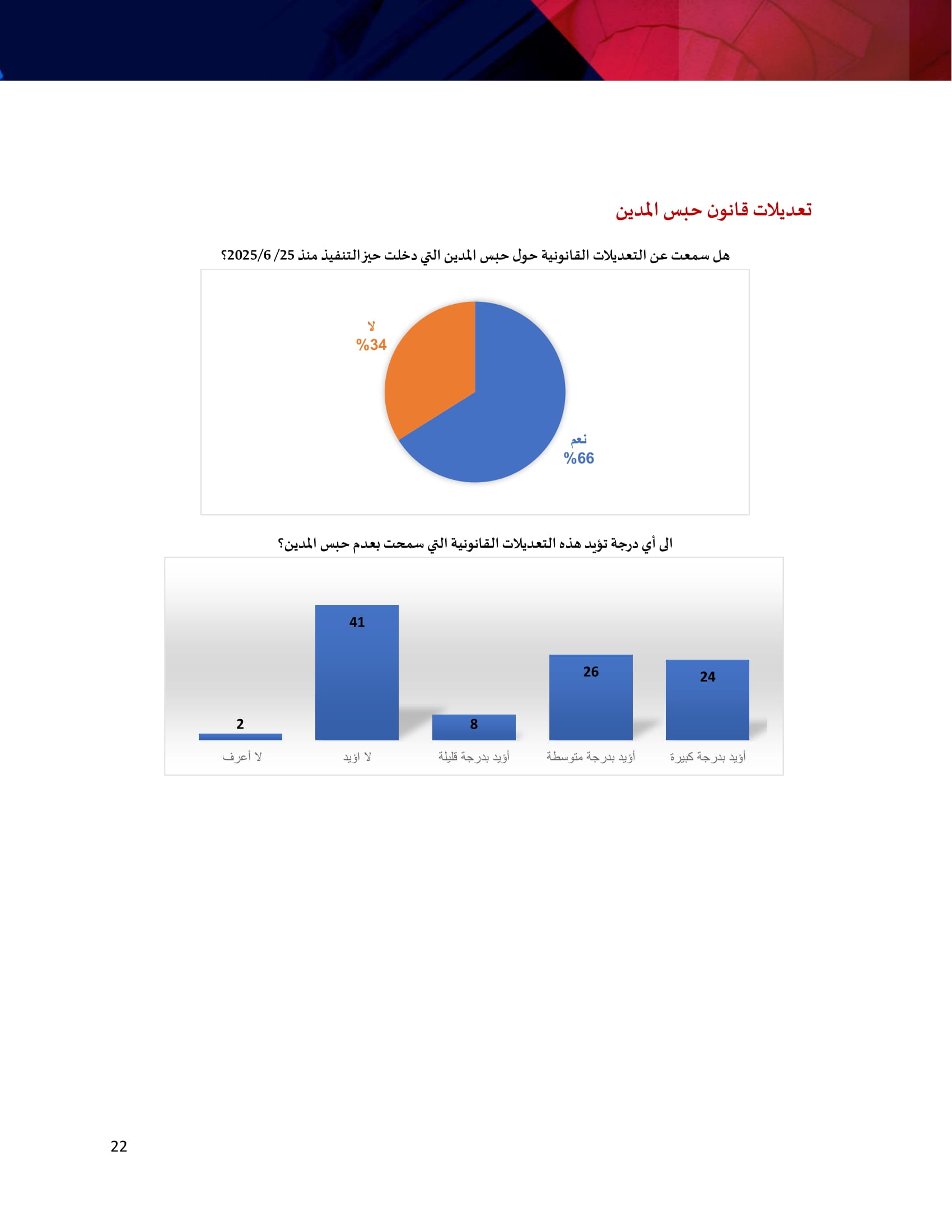 وفيما يتعلق بتعديلات قانون التنفيذ المتعلقة بحبس المدين، أفاد الاستطلاع أن قرابة ثلثيّ الأردنيين (66%) سمعوا عن هذه التعديلات، فيما لم يسمع عنها قرابة 34% ويؤيد هذه التعديلات 58% من الأردنيين، منهم 24% بدرجة كبيرة، و26% بدرجة متوسطة، و8% بدرجة قليلة 8%، فيما أفاد 41% أنهم لا يؤيدونها.
