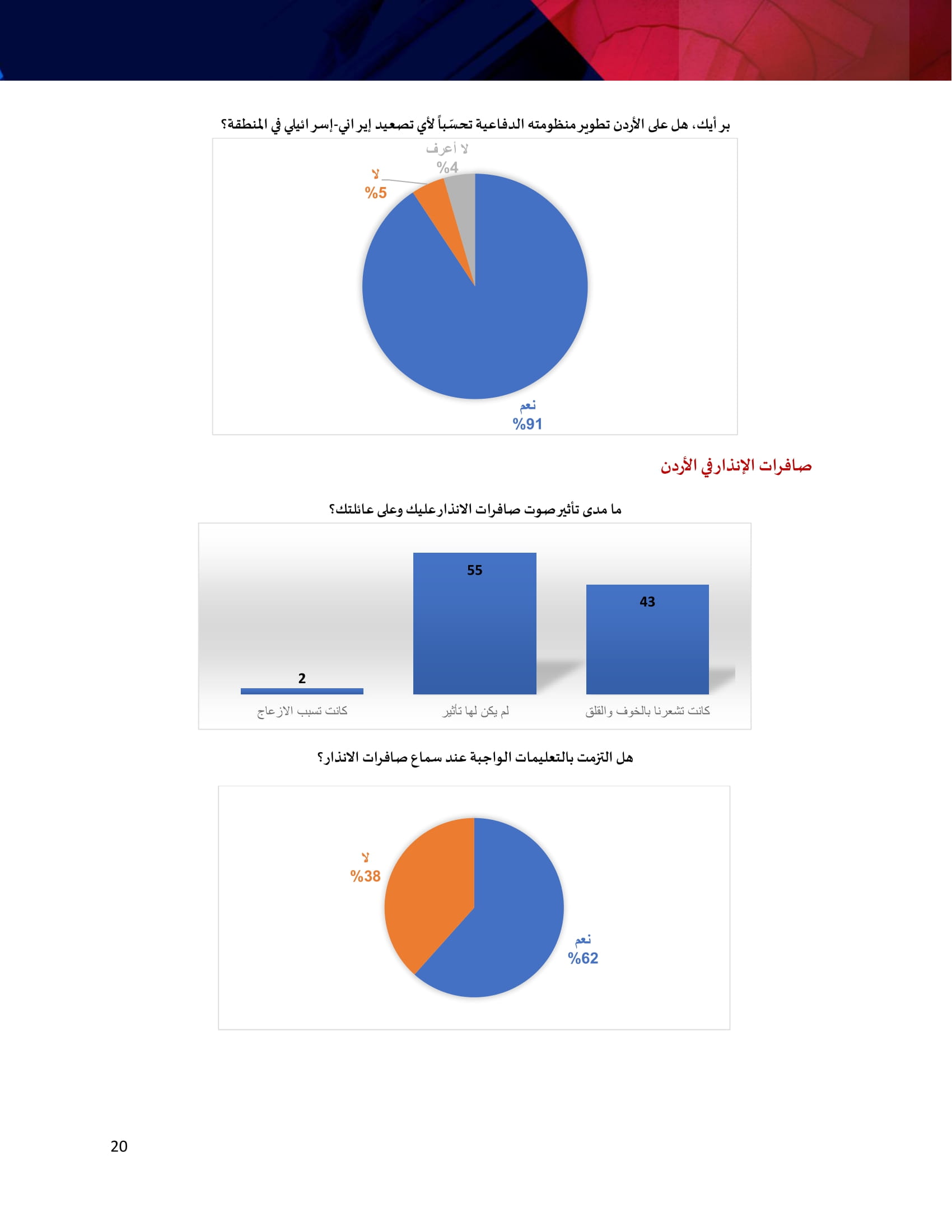 ويعتقد 91% من الأردنيين أنه يجب تطوير منظومة الأردن الدفاعية تحسّباً لأيّ تصعيد إيراني- إسرائيلي في المنطقة، فيما لا يعتقد بضرورة ذلك 5% من الأردنيين فقط.
