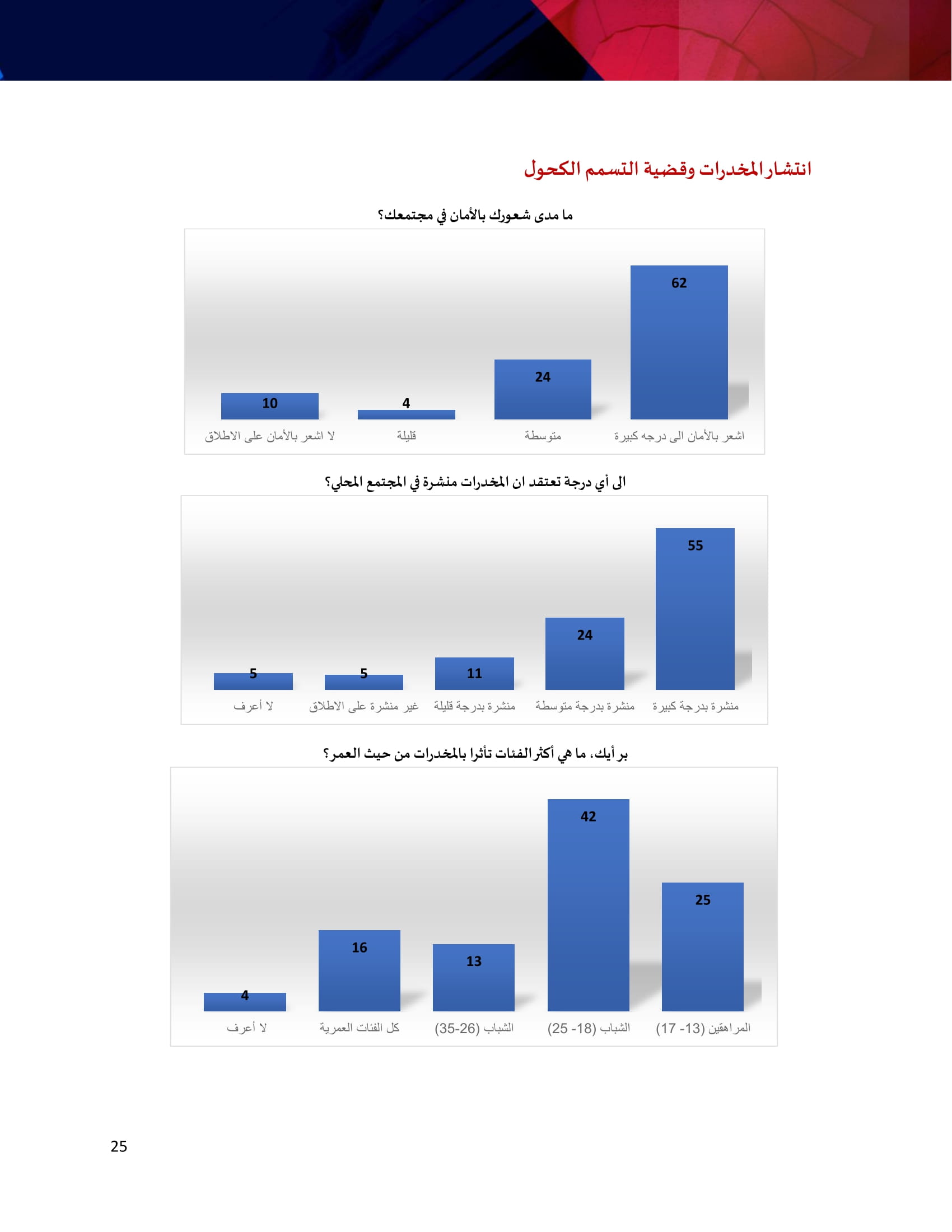 وفيما يتعلق بالقضايا التي تهدد الأمن المجتمعي كالمخدرات، يعتقد 55% من الأردنيين أنها منتشرة بدرجة كبيرة في المجتمع، و24% يعتقدون أنها منتشرة بدرجة متوسطة، و11% منتشرة بدرجة قليلة، و5% غير منتشرة على الإطلاق. ويرون كذلك أن فئة الشباب (18-25 سنة) هي أكثر الفئات تأثراً بالمخدرات، تليها المراهقين (13-17 سنة) بنسبة 25%، ومن ثم الشباب (26 – 35) سنة بنسبة 13%، فيما أفاد 16% أن جميع الفئات العمرية متأثرة بالمخدرات.