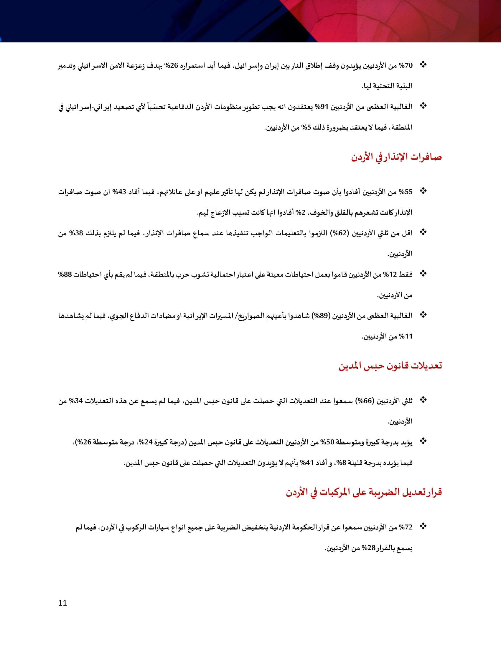 وحول استخدام صافرات الإنذار في الأردن خلال النزاع الإيراني الإسرائيلي، أفاد 55% من الأردنيين أن صوت صافرات الإنذار لم يكن له تأثير عليهم أو على عائلاتهم، فيما أفاد 43% أن صوتها كان يشعرهم بالقلق والخوف، فيما أفاد 2% أنها كانت تسبب الإزعاج لهم فقط.