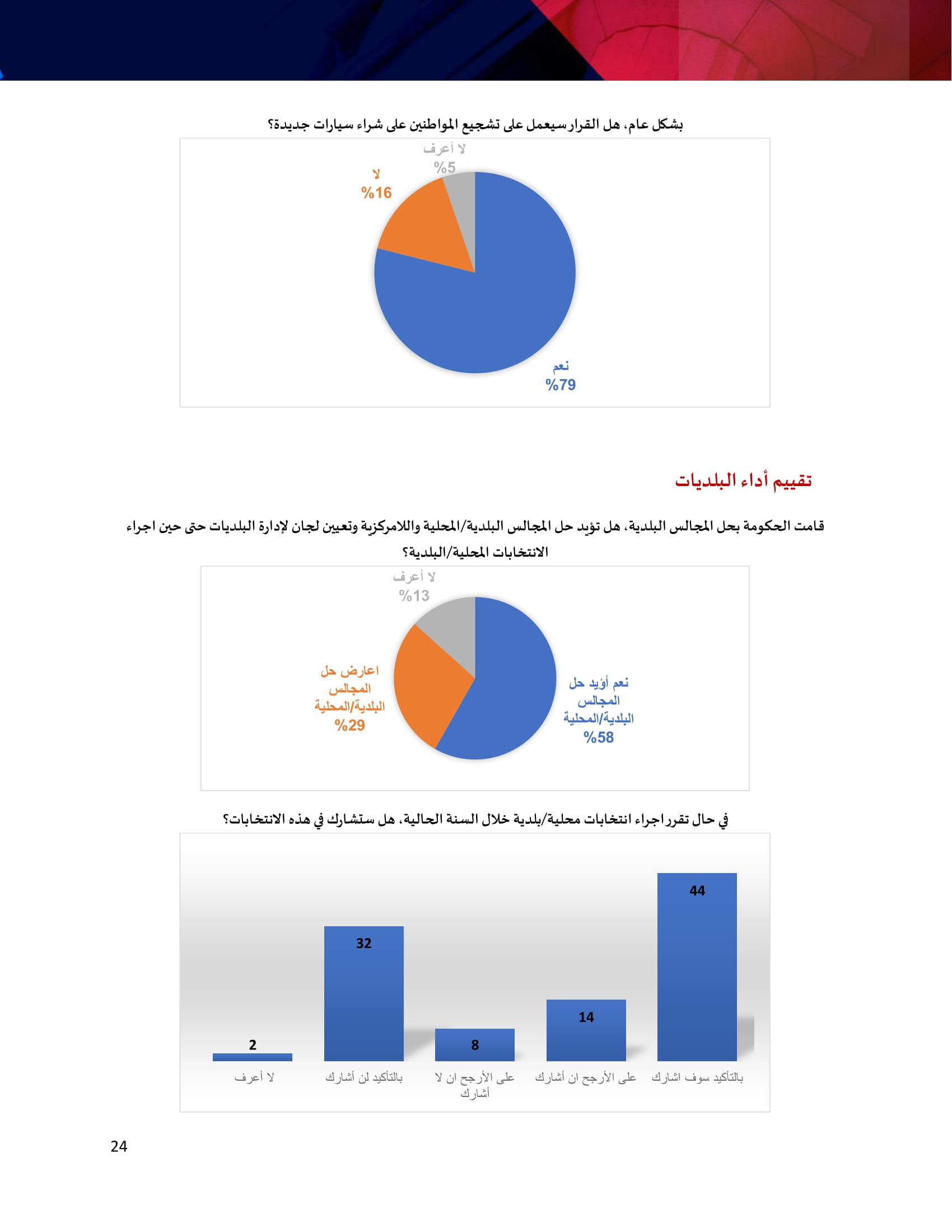 وفي نفس السياق، أكَّد 44% من أفراد العينة المستجيبة أنهم سيشاركون بشكل مؤكد في الانتخابات المحلية المقبلة (البلدية ومجالس المحافظات) فيما أفاد 14% أنهم على الأرجح سيشاركون، و40% أنهم على الأرجح لن يشاركوا في الانتخابات المحلية القادمة.
