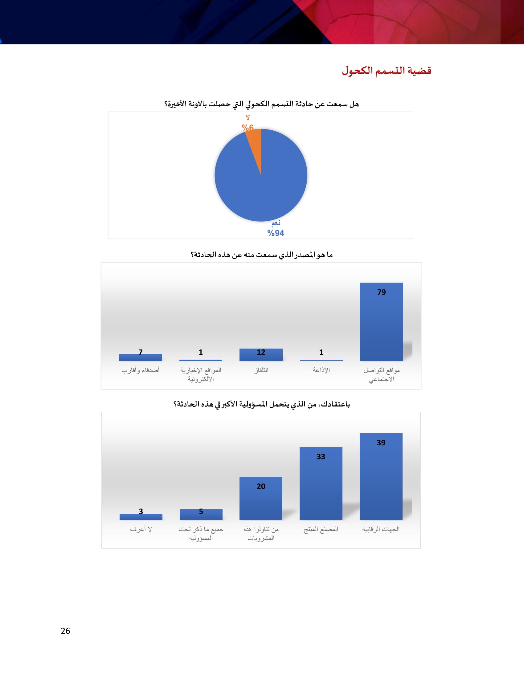 وفيما يخص قضية التسمم بالكحول التي حدثت الشهر الماضي، أفاد 39% أنهم يعتقدون بأن الجهات الرقابية هي من يتحمل المسؤولية الأكبر في هذه الحادثة، فيما أفاد 33% أن المصنع المنتح هو من يتحمل المسؤولية الأكبر، و20% حملوا المسؤولية للأفراد الذين تناولوا هذه المشروبات، فيما أفاد 5% أن جميع الأطراف تتحمل مسؤولية ما حدث.