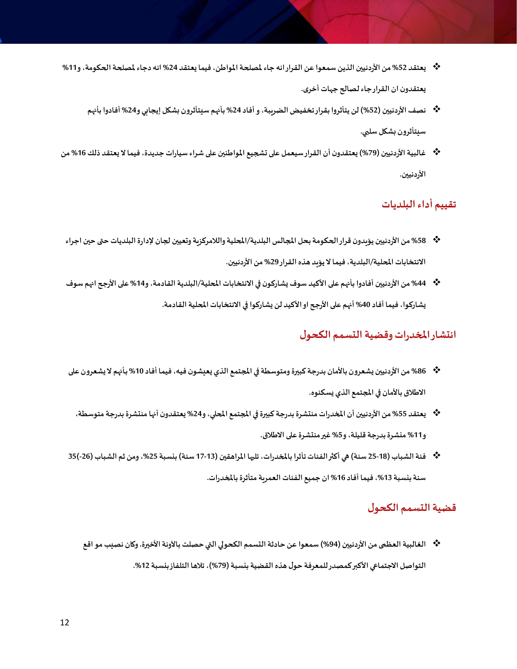 وفيما يتعلق بالقرارات التي اتخذتها الحكومة خلال الشهور الماضية، أفاد الاستطلاع أن 58% من الأردنيين يؤيدون قرار الحكومة بحل المجالس البلدية ومجالس المحافظات وتعيين لجان لإدارتها لحين إجراء الانتخابات، فيما لم يؤيد هذا القرار 29% من أفراد العينة المستجيبة.