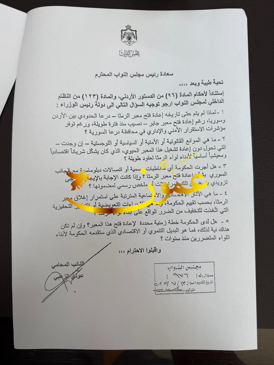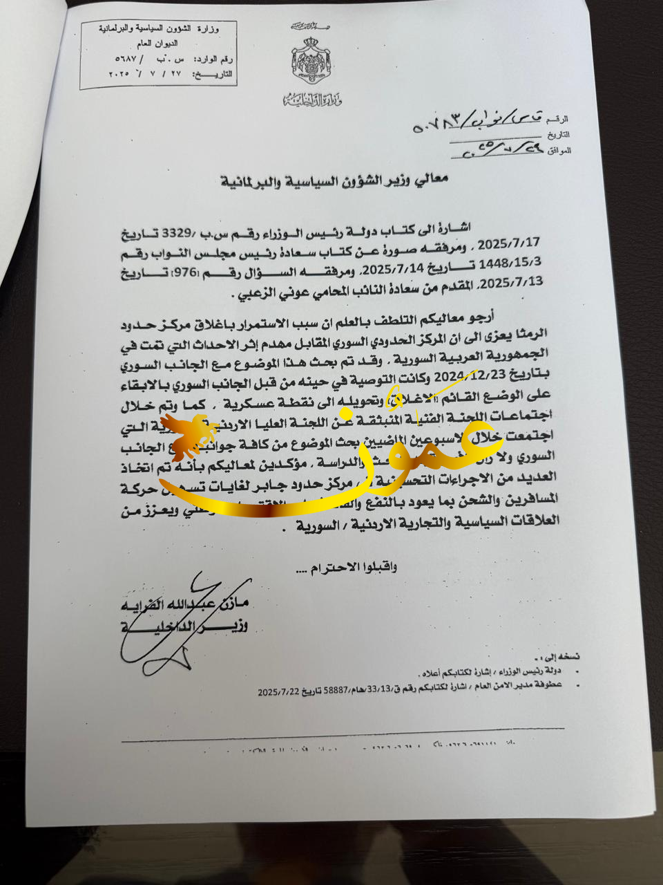 الزعبي يتلقى ردًا رسميًا حول استمرار إغلاق معبر الرمثا