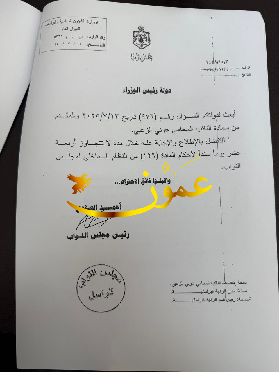 عمون - أعلن النائب المحامي عوني الزعبي، عن تلقيه إجابة على سؤاله النيابي عن موعد فتح معبر جابر، وما يشكله من أعباء اقتصادية على أبناء لواء الرمثا.