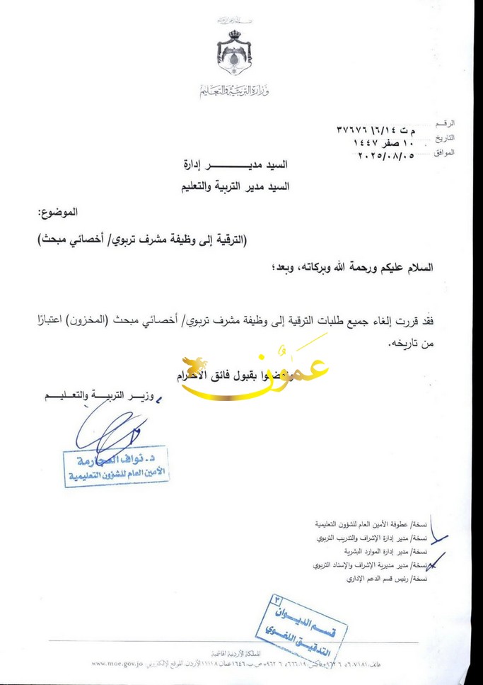 عمون - قررت وزارة التربية والتعليم إلغاء جميع طلبات الترقية المقدّمة إلى وظيفة مشرف تربوي/ أخصائي مبحث (المخزون)، وذلك اعتبارًا من تاريخ 2025/8/5.