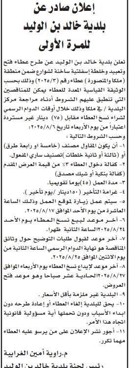 عطاء فتح وتعبيد خلطة اسلفتية لشوارع بلدية خالد بن الوليد