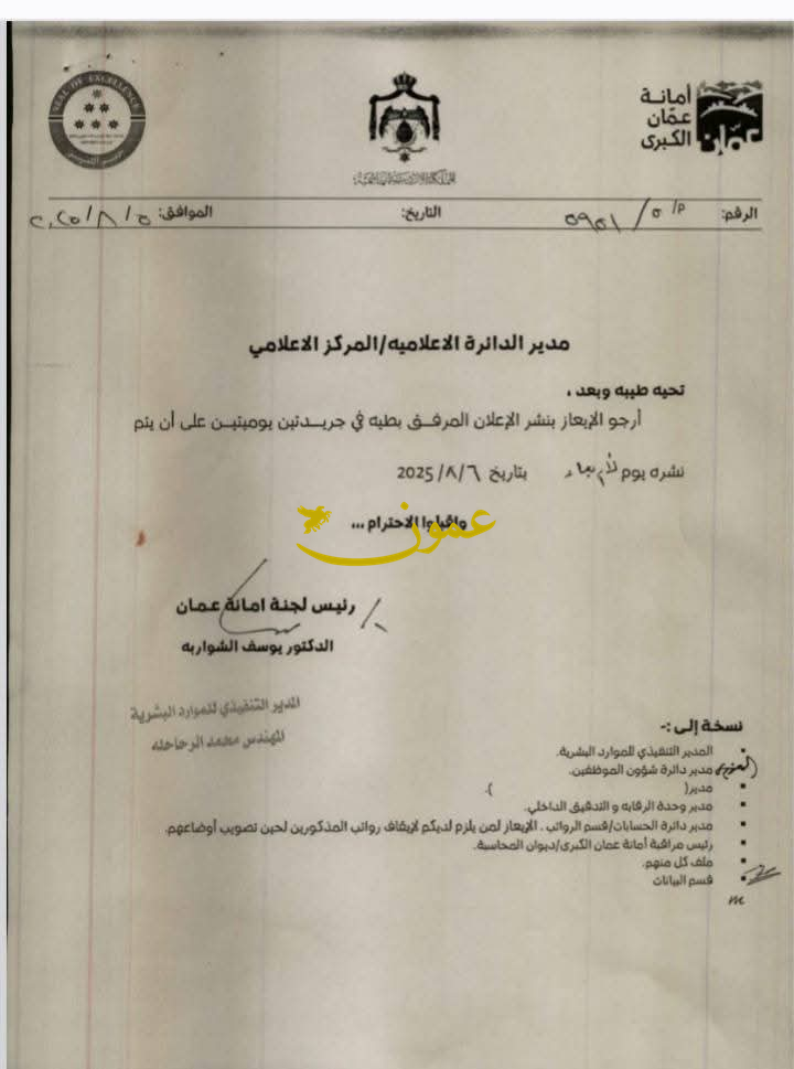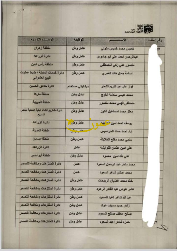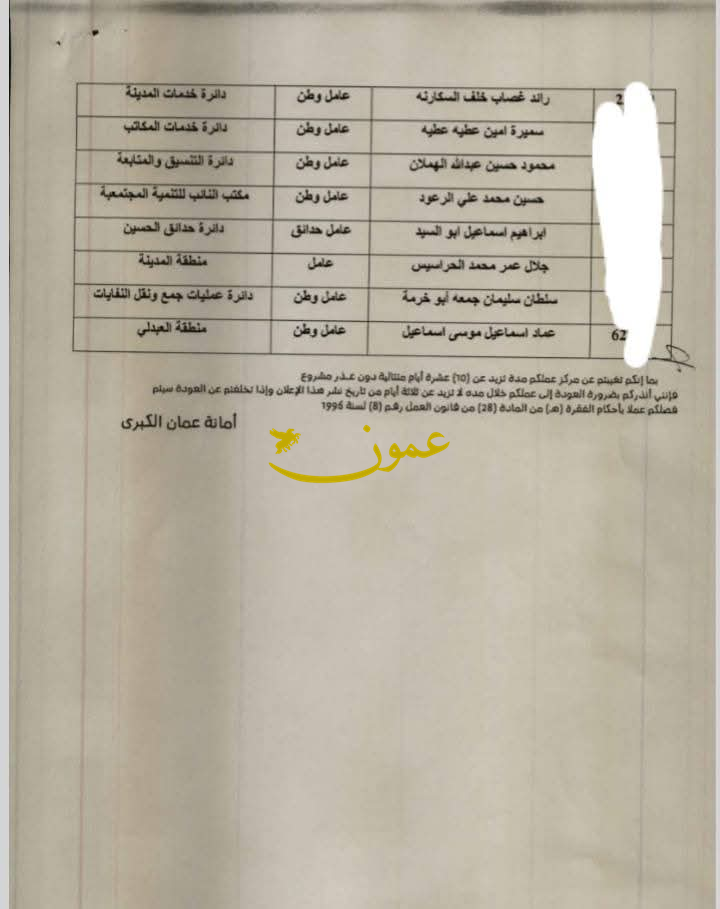 أمانة عمّان تُنذر 29 موظفًا بالفصل (أسماء)07-08-2025 02:19 AM