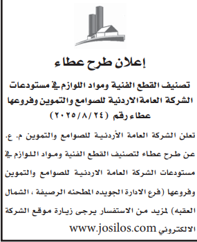 عطاء صادر عن الشركة العامة الاردنية للصوامع والتموين