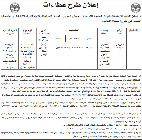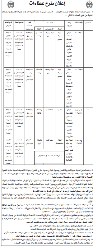 عطاءات صادرة عن القيادة العامة للقوات المسلحة الاردنية
