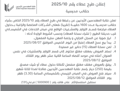 عطاء صادر عن نقابة المهندسين الاردنيين