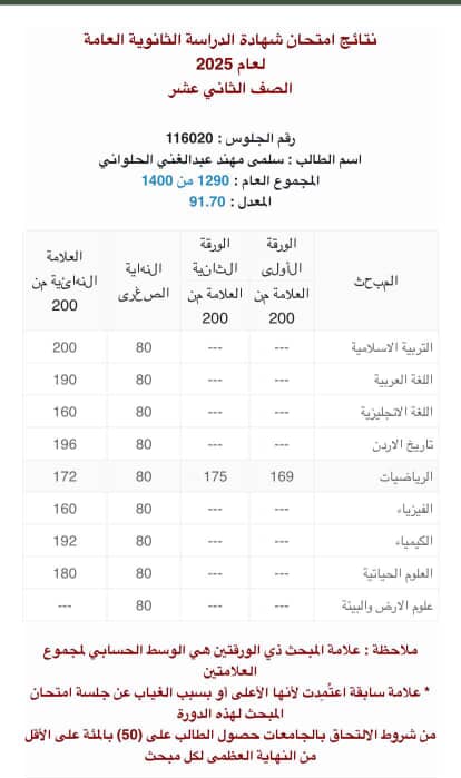 عمون - يتقدم الأهل والأقرباء والأصدقاء بأسمى آيات التهنئة والتبريك للطالبة سلمى مهند عبدالغني الحلواني، بمناسبة نجاحها في الثانوية العامة الفرع العلمي، وحصولها على معدل 91.7%.
