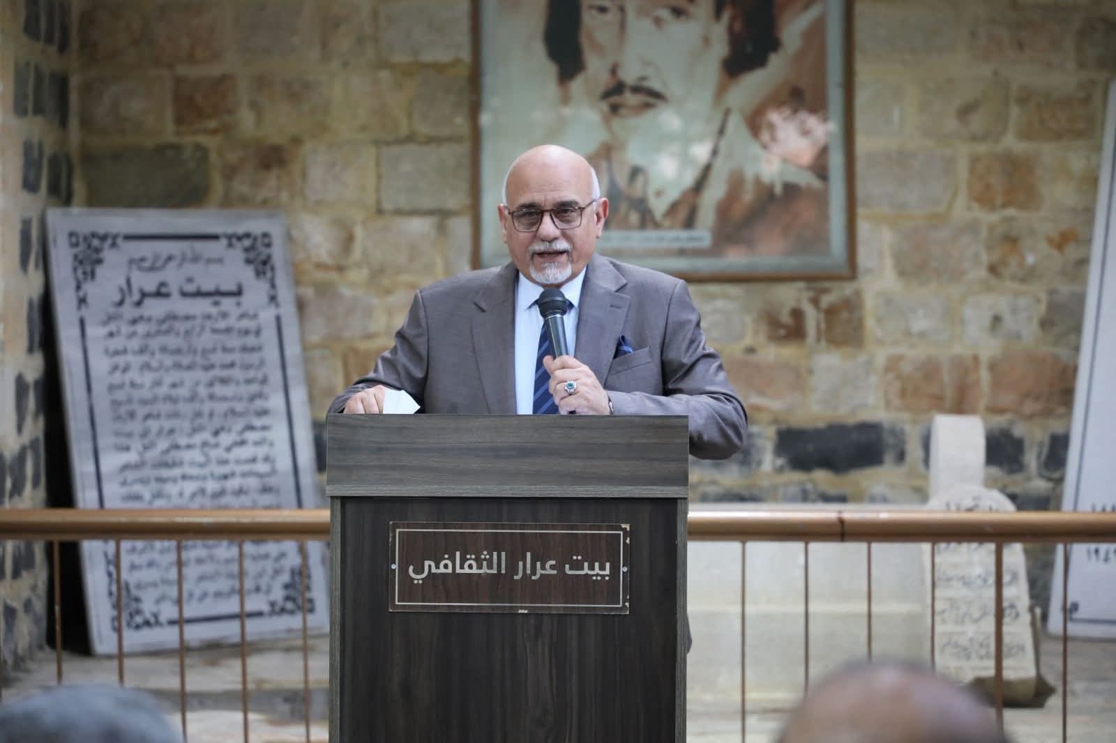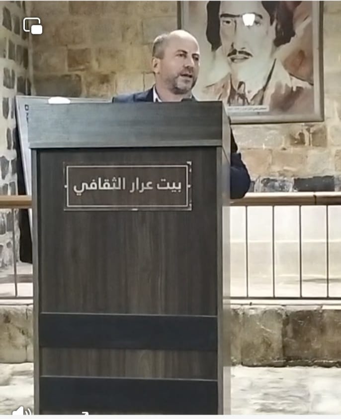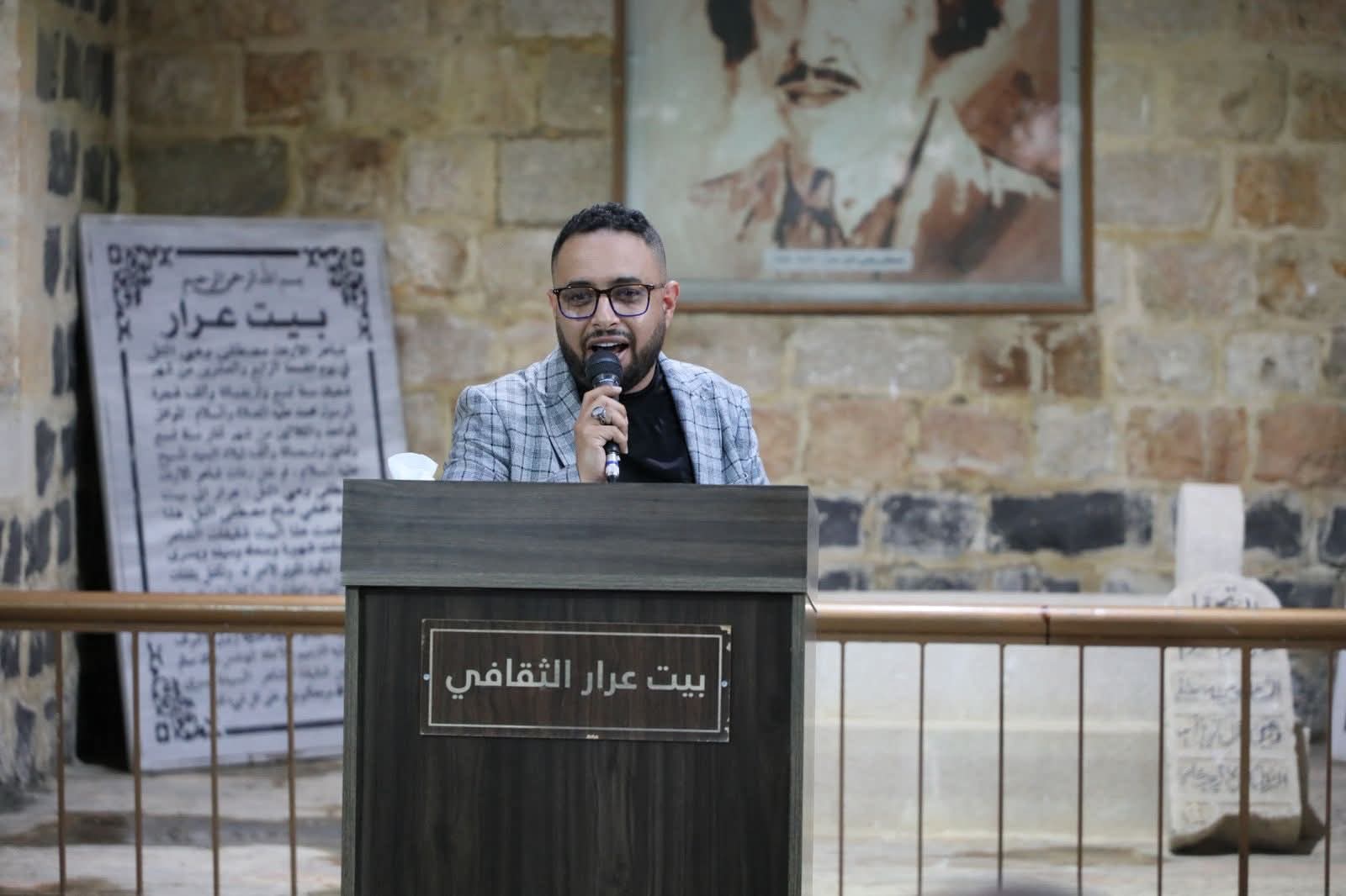 واستهلت فعاليات الحفل بكلمة للدكتور نضال العياصرة راعي الحفل قال فيها "كان الشعر ديوان العرب حيث كانت تحلق شجونهم وتتجلى بأبهى الصور الفنية والجمالية. وها نحن في هذا المساء ومن ببت عرار ، بيت شاعر الاردن مصطفى وهبي التل ازجي اجمل التحايا للقائمين على هذا المهرجان.