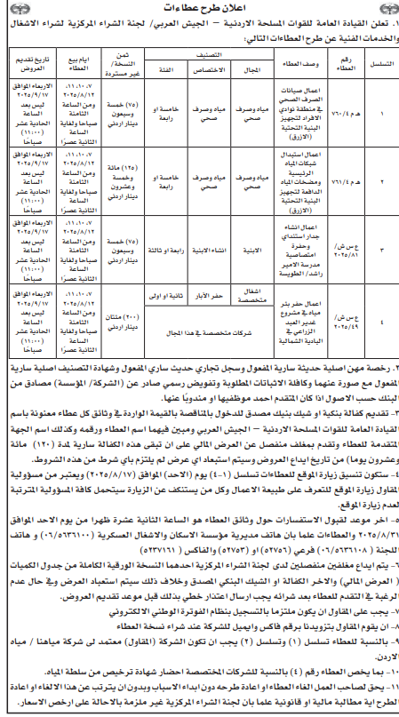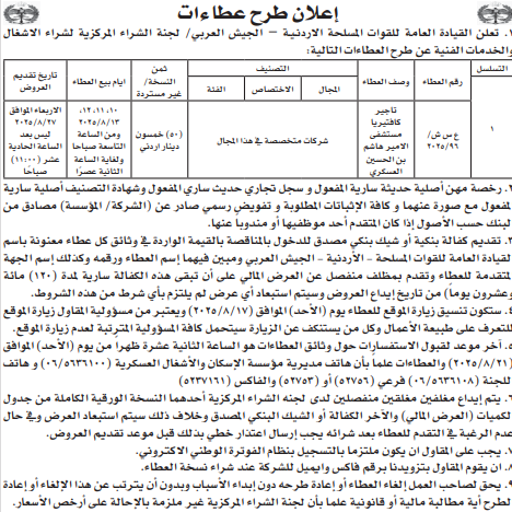 عطاءات صادرة عن القيادة العامة للقوات المسلحة الاردنية