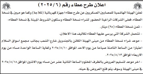 عطاء شراء ثلاجة للهيئة الهاشمية للمصابين العسكريين