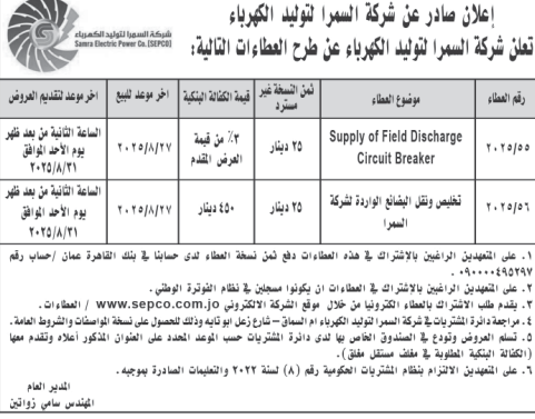 عطاءات صادرة عن شركة السمرا لتوليد الكهرباء