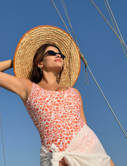 هذا الستايل اعتمدته الممثلة اللبنانية سينتيا خليفة، حيث ارتدت بدلة سباحة من قطعة واحدة باللونين البرتقالي والأبيض، ولفّت وشاحاً شاطئياً أبيض على خصرها.