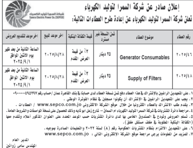 عطاءات صادرة عن شركة السمرا لتوليد الكهرباء
