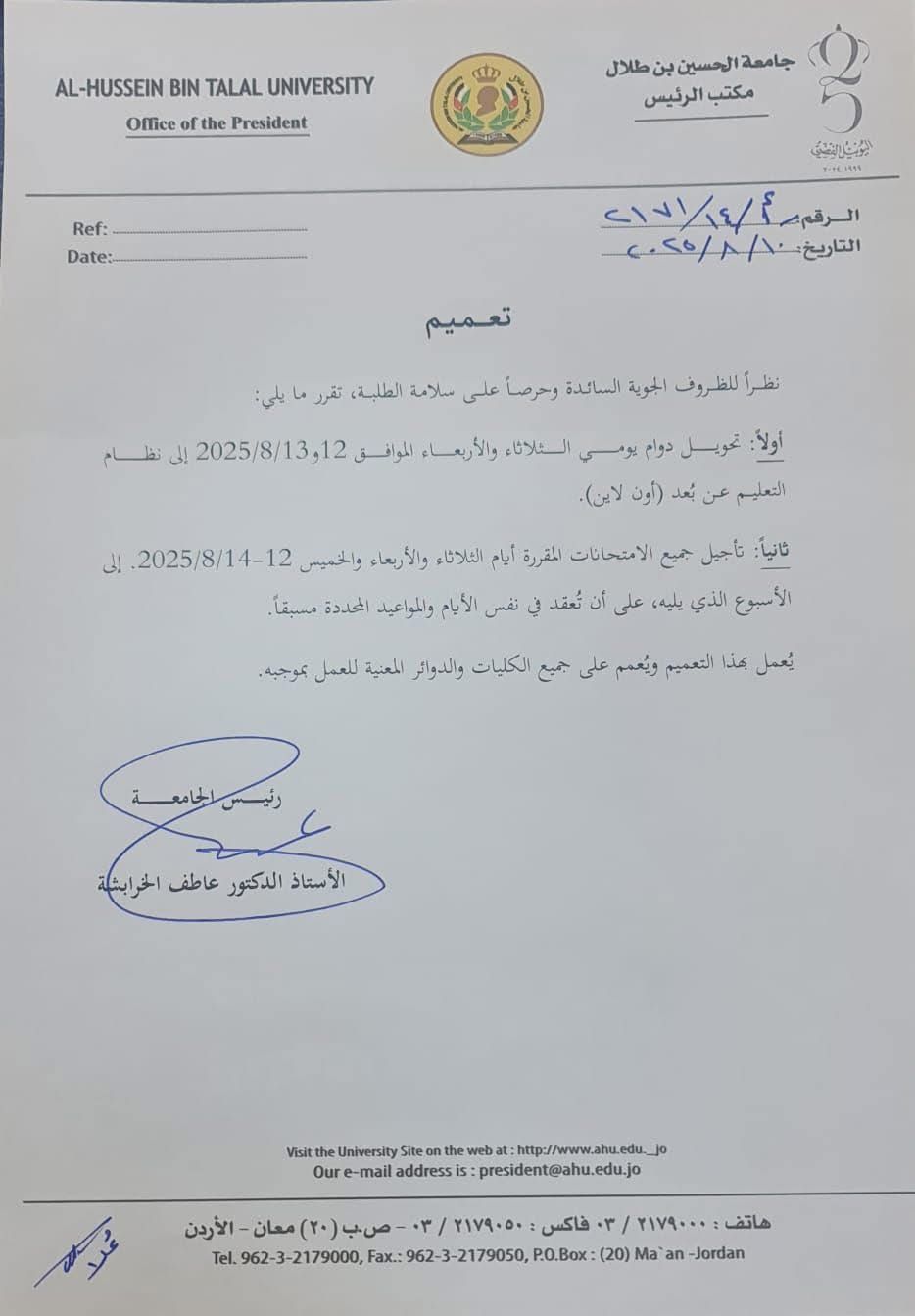 جامعة الحسين بن طلال تتحول للدوام عن بعد بسبب الحر11-08-2025 11:55 AM