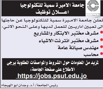 وظائف شاغرة لدى جامعة الاميرة سمية للتكنولوجيا