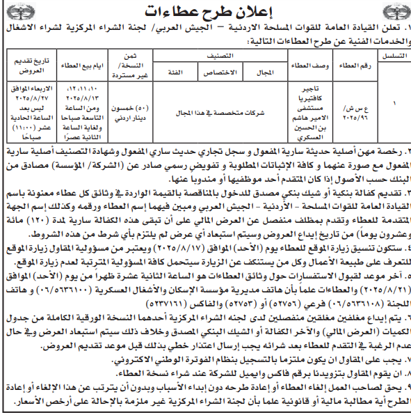 عطاء صادر عن القيادة العامة للقوات المسلحة الاردنية