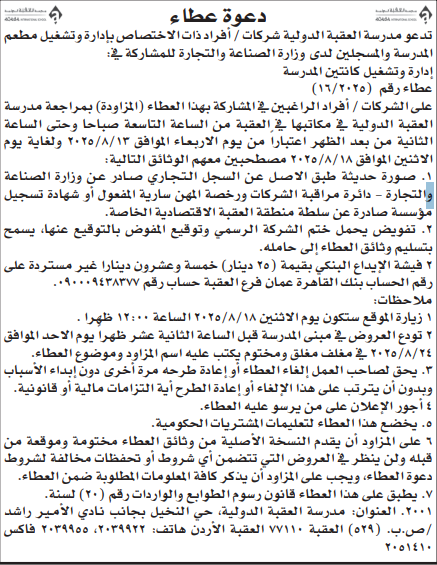عطاء صادر عن مدرسة العقبة الدولية