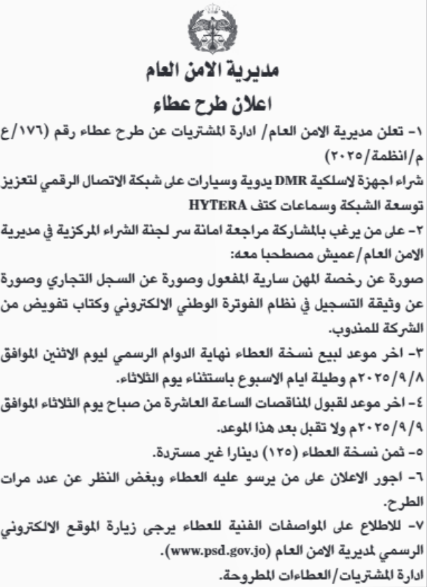 عطاء صادر عن مديرية الامن العام