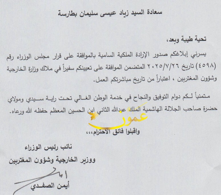جاء ذلك في رسالة للصفدي وجهها للبطارسة يبلغه بها بصدور الإرادة الملكية بذلك.