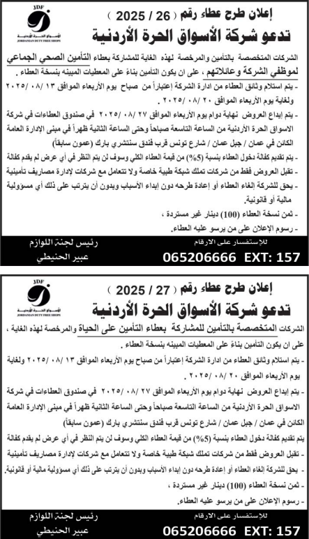 عطاءات صادرة عن الاسواق الحرة الاردنية