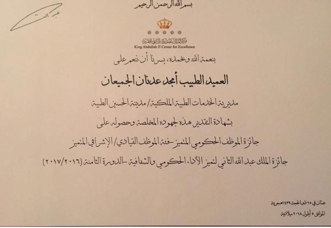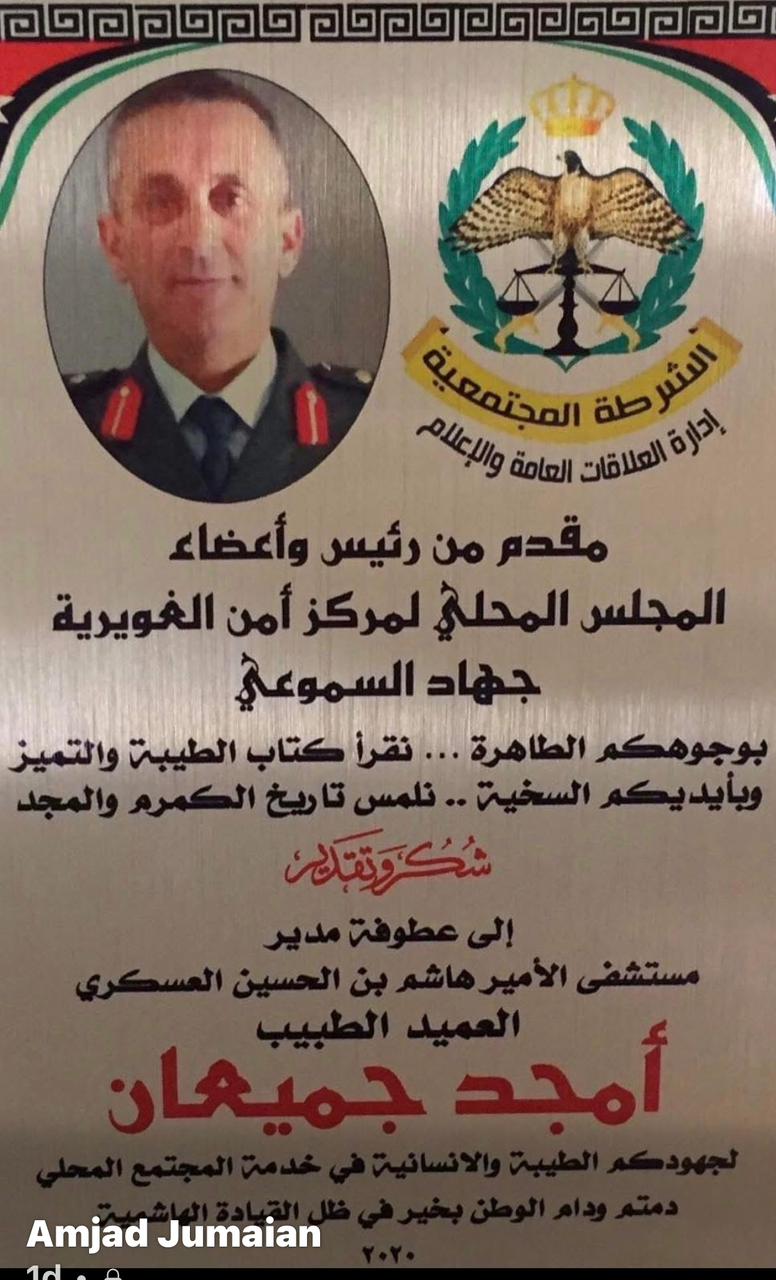 وقد منحتني القيادات المجتمعية في محافظة الزرقاء درع الخدمة المجتمعية تقديراً لجهودي في خدمة المجتمع المحلي بافتتاح عيادات اختصاص تُدار من قبل اطباء اختصاص خارج حرم المستشفى في عيادات أسرة الجندي بحى الغويرية في محافظة الزرقاء وعيادات مركز طبي الازرق لتخفيف ضغط الاكتضاض داخل حرم المستشفى الرئيسي .