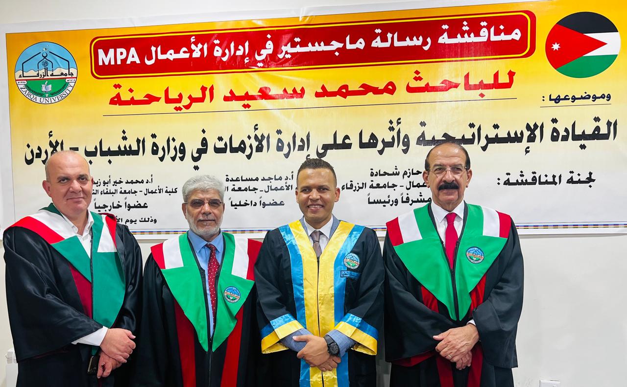 وناقش الرياحنة رسالة حملت عنوان: "القيادة الاستراتيجية وأثرها على ادارة الأزمات في وزارة الشباب - الأردن"، أمام لجنة المناقشة المكونة من الاستاذ الدكتور حازم شحادة (مشرفًا)، والاستاذ الدكتور ماجد مساعدة (عضوًا داخليا)، الأستاذ الدكتور محمد ابو زيد (عضوًا خارجيا).