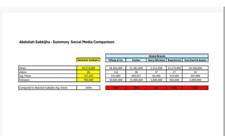 عمون - سجلت مجوهرات عبدالله سكجها إنجازًا لافتًا في عالم صناعة الحلي والمجوهرات، حيث حققت تفوقًا بلغة الأرقام على أبرز العلامات التجارية العالمية، متجاوزةً العلامات التجارية العالمية مقارنة بمتوسط المشاهدات عبر منصات التواصل الاجتماعي مع :وفقًا لآخر الإحصائيات، حققت مجوهرات عبدالله سكجها نتائج ملفتة على منصات التواصل الاجتماعي مقارنة بعدد من العلامات العالمية في مجال المجوهرات، حيث جاءت الأرقام على النحو التالي: إجمالي المشاهدات: 34,374,000 مشاهدة. عدد الفيديوهات المنشورة: 46 فيديو. متوسط المشاهدات لكل فيديو: 747,261 مشاهدة، وهو المعيار الذي تم اعتماده بنسبة 100% للمقارنة مع المنافسين. عدد المتابعين: 760,000 متابع.