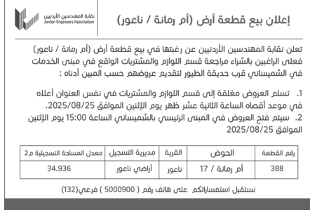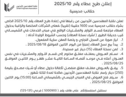 عطاءات صادرة عن نقابة المهندسين الاردنيين