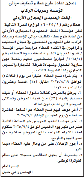 عطاء شراء خدمات التنظيف لمباني مؤسسة الخط الحديدي الحجازي الاردني