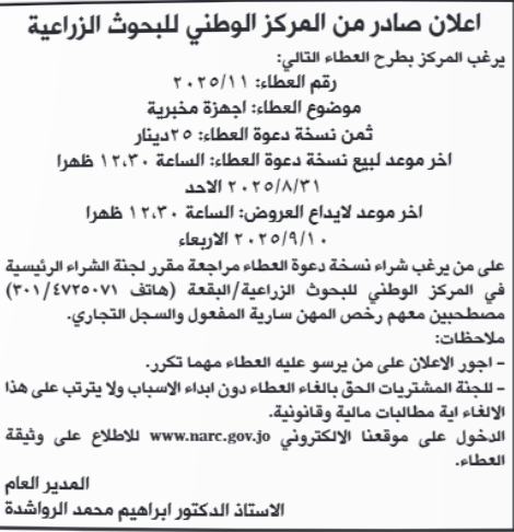 عطاء شراء اجهزة مخبرية للمركز الوطني للبحوث الزراعية