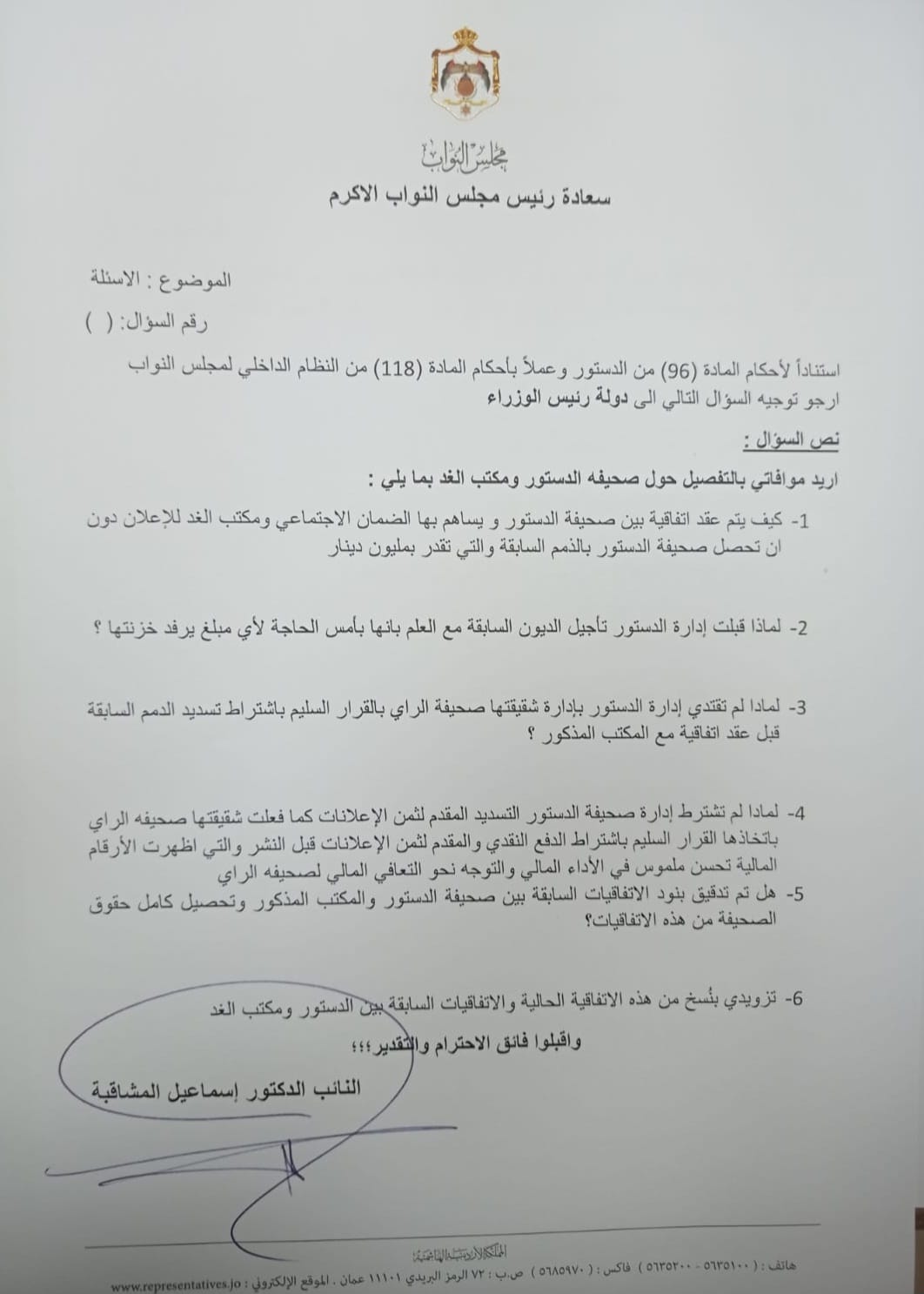 سؤال نيابي عن سبب تأجيل صحيفة الدستور لديون مستحقة19-08-2025 05:58 PM