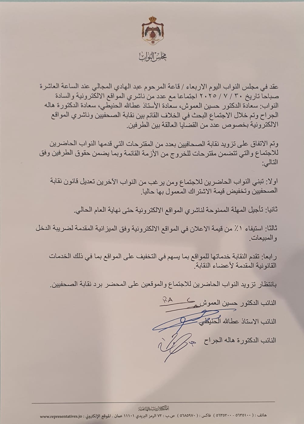 عمون - اتفق عدد من أعضاء مجلس النواب، مع عدد من ناشري المواقع الإلكترونية، على تسليم نقابة الصحفيين، عددًا من المقترحات بشأن القضايا العالقية بين الطرفين.