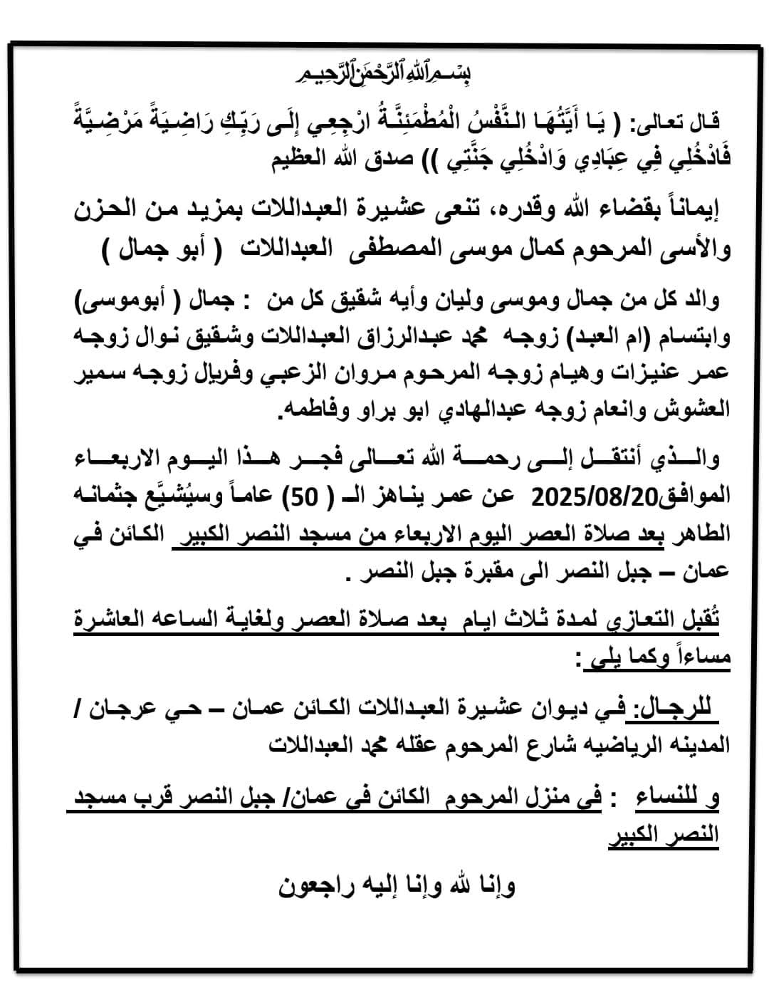 عمون - إيماناً بقضاء الله وقدره، تنعى عشيرة العبداللات بمزيد من الحزن والأسى المرحوم