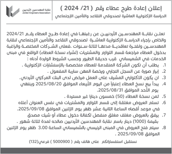عطاء صادر عن نقابة المهندسين الاردنيين