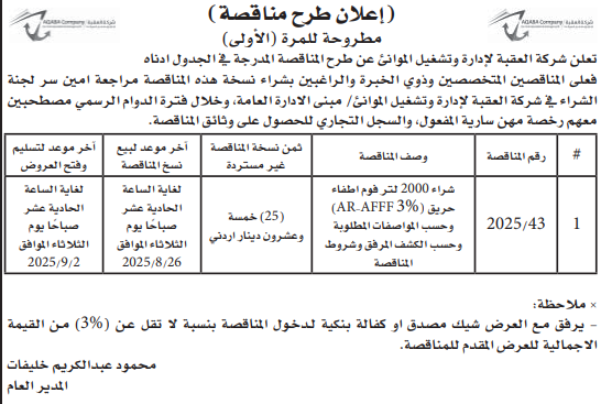 عطاء صادر عن شركة العقبة لادارة وتشغيل الموانئ
