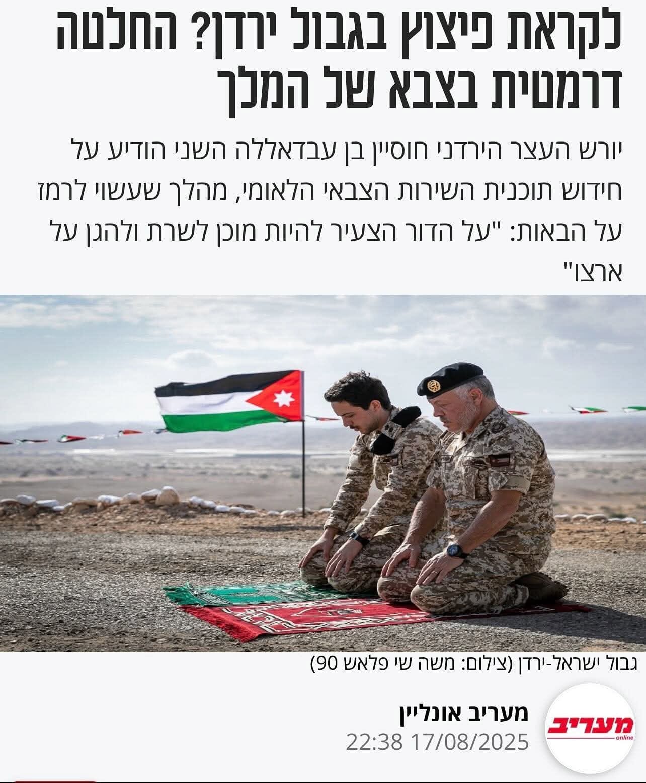 في 17 آب/أغسطس 2025، نشر الإعلام العبري صورة تظهر الملك عبد الله الثاني على الحدود الأردنية – الإسرائيلية، يقف بجوار ولي العهد الأمير الحسين، وهما في وضع الصلاة على سجادة أمام العلم الأردني. المشهد يرمز إلى الدمج بين القيادة العليا، الدين، والالتزام الوطني، ويؤكد أن الجيش الأردني مؤسسة عقيدتها راسخة عبرت عنها رسالة عمان، تحمي الهوية والسيادة، تحت قيادة الملك الحكيمة.