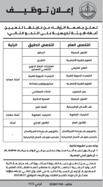 جامعة الزرقاء بحاجة لتعيين اعضاء هيئة تدريسية