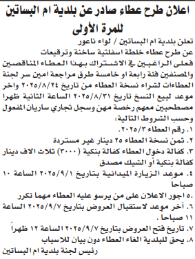عطاء توريد خلطة اسفلتية ساخنة لشوارع بلدية ام البساتين