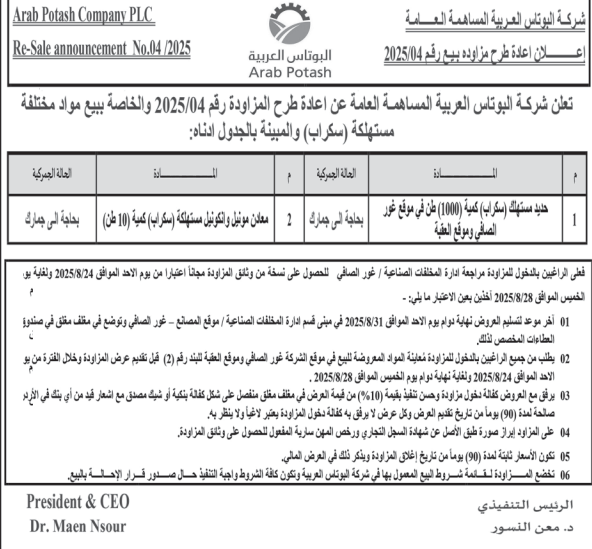 عطاء صادر عن شركة البوتاس العربية