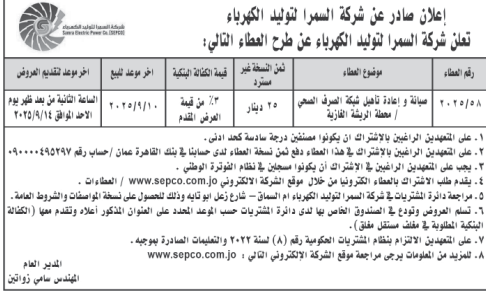 عطاء صادر عن شركة السمرا لتوليد الكهرباء