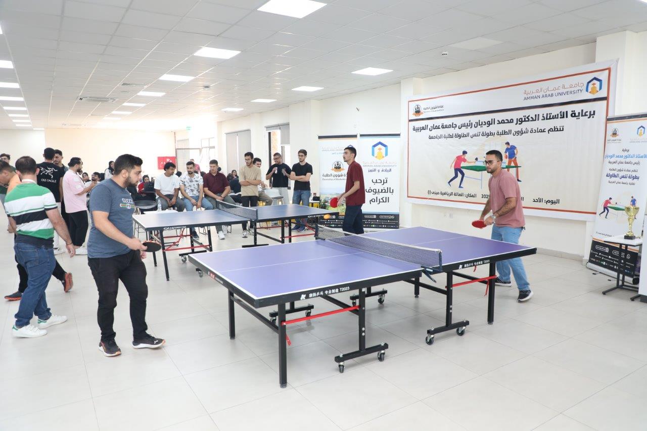 عمون - في إطار حرص جامعة عمان العربية على تعزيز النشاط الرياضي وتنمية مهارات الطلبة وتحت رعاية الأستاذ الدكتور محمد الوديان رئيس جامعة عمان العربية، نظمت عمادة شؤون الطلبة / قسم الأنشطة الطلابية في الجامعة بطولة تنس الطاولة لطلبة الجامعة من مختلف التخصصات، وافتتح البطولة الأستاذ الدكتور إسماعيل يامين مساعد الرئيس للشؤون الاكاديمية مندوباً عن رئيس الجامعة، حيث أعرب عن تمنياته للمشاركين بتحقيق نتائج متميزة، مؤكّدًا على ضرورة التحلي بالروح الرياضية التي تعزز ثقافة التعاون والاحترام بين الطلبة.