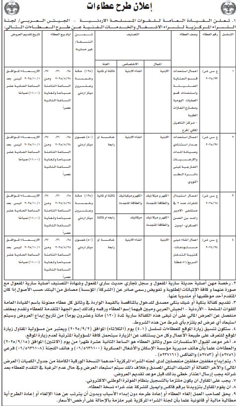 عطاءات صادرة عن القيادة العامة للقوات المسلحة الاردنية