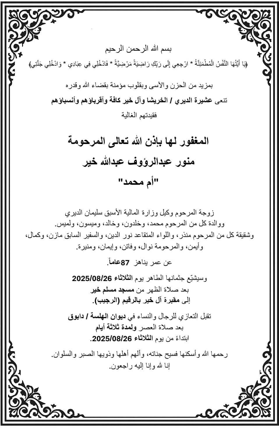وسيشيع جثمانها الطاهر الثلاثاء 2025/08/26 بعد صلاة الظهر من مسجد مسلم خير إلى مقبرة آل خير بالرقيم (الرجيب).